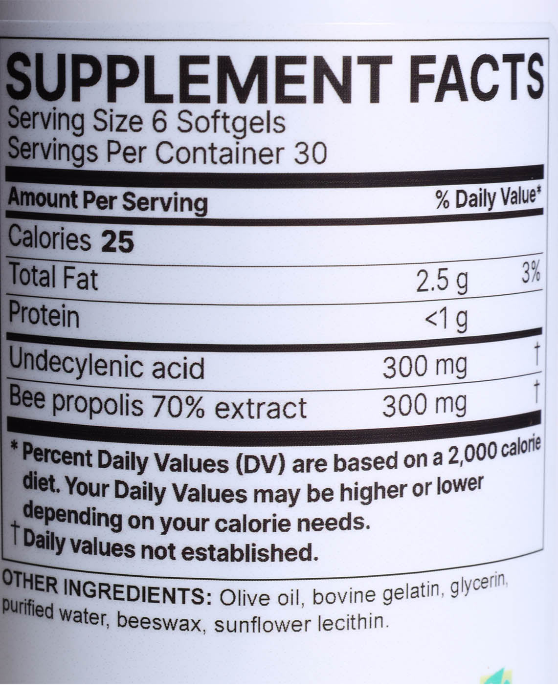 Undecylenic acid is an organic fatty acid derived from castor bean oil that can help balance yeast in the gi tract. Bee propolis is a plant resin that bees use to line their hives.