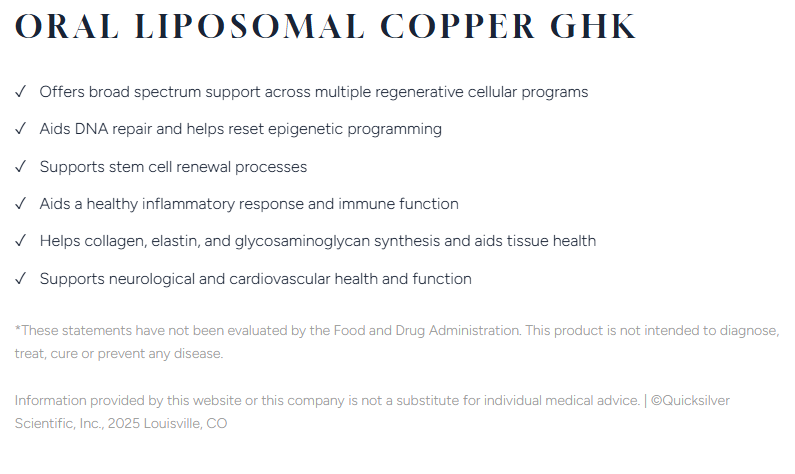 Copper GHK is an oral liposomal copper tripeptide complex, GHK-Cu, designed to help replenish endogenous GHK-Cu to more youthful levels. GHK is a naturally occurring bioactive amino that forms an ionic complex with copper in human plasma. As we age, normal levels of GHK-Cu decrease.