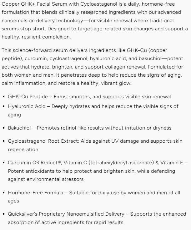 Copper GHK+ Facial Serum with Cycloastagenol is a daily, hormone-free formulation that blends clinically researched ingredients with our advanced nanoemulsion delivery technology—for esigned to target age-related skin changes and support a healthy, resilient complexion.